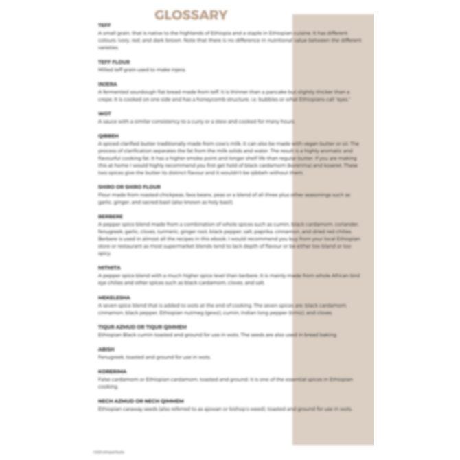 A fully plant-based and gluten free selection of Ethiopian recipes. If you are not familiar with Ethiopian food, it is full of distinct flavours and vibrant colours. We love to cook with greens, pulses, and legumes. The ebook covers the essential Ethiopian dishes to help you create the perfect vegan beyaynetu (a mix of vegan dishes) served on a plate of injera. There is a glossary at the end for you to refer to. I have also included notes for each recipe, with suggestions for substitutions and other tips.