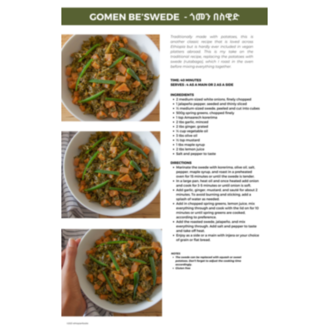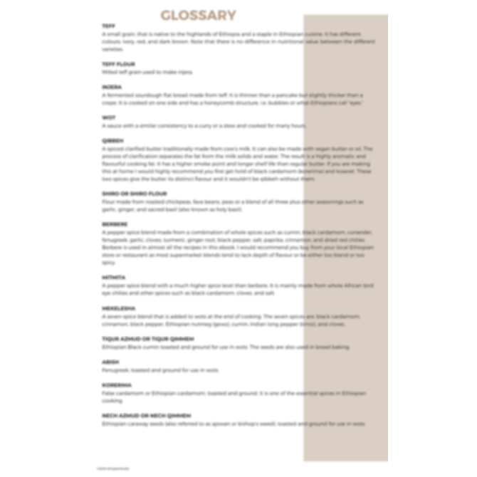 A fully plant-based and gluten-free selection of Ethiopian recipes. This ebook highlights recipes that you don't usually find in restaurants outside of Ethiopia. There is a glossary at the end for you to refer to. I have also included notes for each recipe, with suggestions for substitutions and other tips.